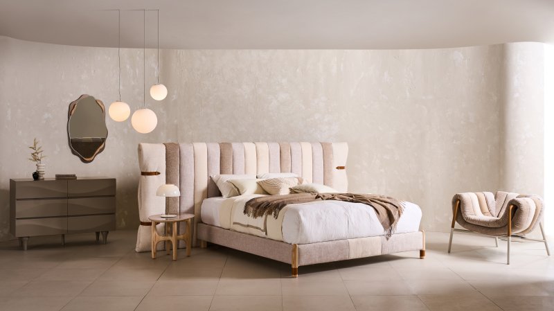 26일 업계에 따르면 현대리바트가 신규 출시한 '버밀리온'은 침대·1인 패브릭 소파·협탁·서랍장·거울로 구성된 하이엔드 침실 가구 라인이다.