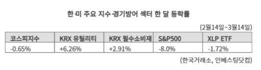 16일 한국거래소에 따르면 올해 초 줄곧 상승세를 보이던 코스피 지수는 최근 한 달(2월14일~3월14일)간 0.65% 하락했다. 반면 경기방어주로 분류되는 'KRX 유틸리티지수'는 6.26% 상승에 성공했다. 'KRX 필수소비재지수'와 'KRX 경기소비재지수'도 각각 2.91%, 1.58% 오르며 선방했다.