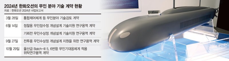 18일 한화오션이 공시한 2024년 사업보고서에 따르면, 회사는 무인 사업을 확대하며 연구개발과 수주 실적을 꾸준히 늘리고 있다. 지난해 무인 사업 신규 계약은 5건으로, 지난 2023년(3건) 대비 크게 증가했다. 특히 지난해 3월 통합제어체계 무인 분야 기술 검토 계약을 체결한 데 이어 △정찰용 무인잠수정 △기뢰전 무인수상정 △전투용 무인수상정 등 다양한 분야로 사업을 확장하고 있다.