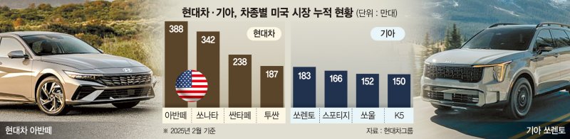 미국 시장에서 가장 많이 팔린 모델은 현대차 아반떼(현지명 엘란트라)다. 아반떼는 1991년 미국 판매를 시작했으며 지난 2월까지 388만대가 팔렸다. 이어 쏘나타(342만대)와 싼타페(238만대), 투싼(187만대) 순으로 집계됐다. 기아는 쏘렌토가 2002년 미국 판매를 시작한 이후 지난해까지 183만대 판매됐다. 그 다음으로는 스포티지(166만대)와 쏘울(152만대), K5(150만대) 순으로 나타났다.