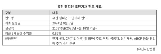 20일 금융정보업체 에프앤가이드에 따르면 유진챔피언초단기채펀드의 설정액은 지난 18일 기준 2103억원이다. 최근 3개월 수익률은 0.82%, 6개월은 1.88% 다.