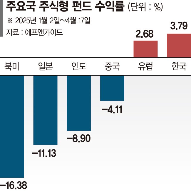 북미 펀드 수익률이 고꾸라진 것은 트럼프 행정부 출범 이후 경기 침체 우려와 상호관세 불확실성이 더해진 여파다. 나스닥 종합지수는 연초 대비 15.53%, 스탠더드앤드푸어스(S&P)500 지수도 이 기간 9.98% 떨어졌다. 항셍(+9.03%), 코스피(+3.52%), 상해종합(+0.43%) 등 주요국보다 큰 폭으로 하락했다.