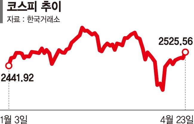 증권사 한 관계자는 "관세 협상에서 불확실성이 해소되기 전까지는 대기 매물 위주의 박스권 장세가 이어질 것"이라며 "연준의 금리 스탠스 변화 가능성까지 맞물리며 기관, 외국인들이 지갑 열기를 꺼린 것"이라고 설명했다.