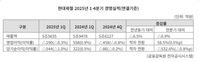 현대제철은 올해 1·4분기 연결기준 매출 5조5635억원, 영업손실 190억원, 당기순손실 544억원을 기록했다고 24일 공시했다. 매출은 전년 동기 대비 0.9% 감소했으나, 지난해 4·4분기 일회성 비용 반영에 따른 기저효과로 영업이익은 전분기 대비 268억원 개선됐다.