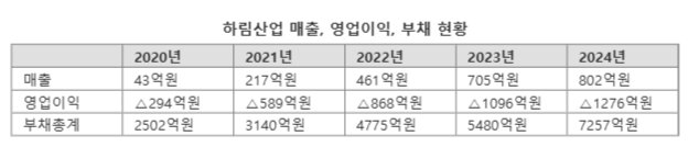 금융감독원 전자공시시스템에 따르면 하림산업은 지난해 1276억원의 영업적자를 기록했다. 영업적자는 매년 커지고 있다. 2020년 294억원, 2021년 589억원, 2022년 868억원, 2023년 1096억원의 적자를 봤다.