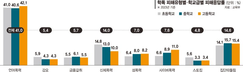 한국청소년정책연구원의 조사에 따르면 학폭 피해 유형이 다양하게 나타났다. 피해 유형별 비중은 언어폭력(41.0%), 집단따돌림(14.6%), 신체폭력(14.0%), 사이버폭력(7.6%), 성폭력(7.0%), 금품갈취(5.7%), 강요(5.4%), 스토킹(4.8%) 순이었다. 이주호 부총리 겸 교육부 장관은 "다양해지고 복잡해지는 학교폭력 양상에 맞춰 실효성 있는 조치를 마련하는 한편, 일상적 갈등은 교육적으로 해결할 수 있는 환경을 조성하겠다"고 말했다.