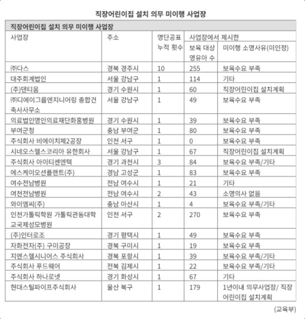 교육부, 홈페이지에 사업장명, 주소 및 사업주의 성명 등 기본 정보 밝혀 [파이낸셜뉴스] 교육부와 고용노동부가 직장내 어린이집 설치 의무를 미이행한 기업 20곳을 공개했다.