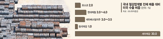 한국 철강업계의 전체 매출에서 미국 시장이 차지하는 비중이 크지 않아 관세 인상에 따른 직접적인 영향은 제한적일 것이란 분석도 나온다. 하나증권에 따르면 철강업체의 미국 매출 비중은 △포스코 2% △현대제철 3~4% △동국제강 1% △