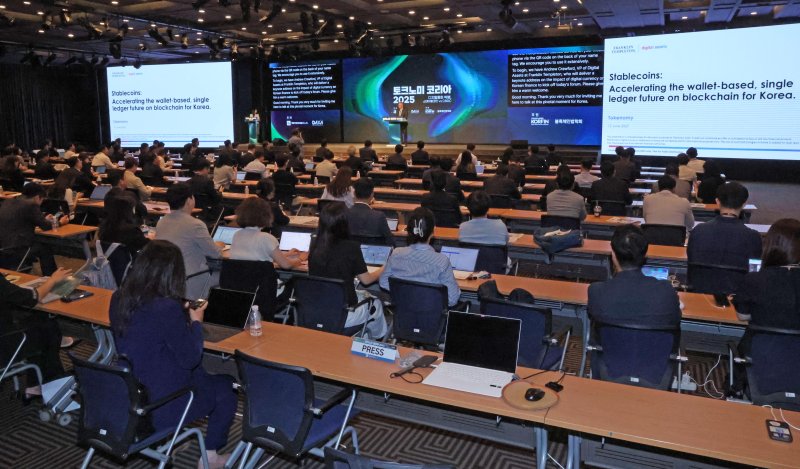 | 디지털 금융혁신 열쇠는… 파이낸셜뉴스와 디지털자산거래소 공동협의체(DAXA)가 12일 서울 여의도 중소기업중앙회에서 공동주최한 '토크노미 코리아 2025'에서 앤드류 크로포드 프랭클린템플턴 디지털자산 부사장이 기조강연을 하고 있다. 사진=박범준 기자 |
