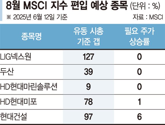 현대건설 등이 꼽힌다. 이들 종목은 최근 주가 상승으로 유동 시가총액 기준선을 상회해 MSCI 편입 요건을 만족시킨 것으로 보인다.