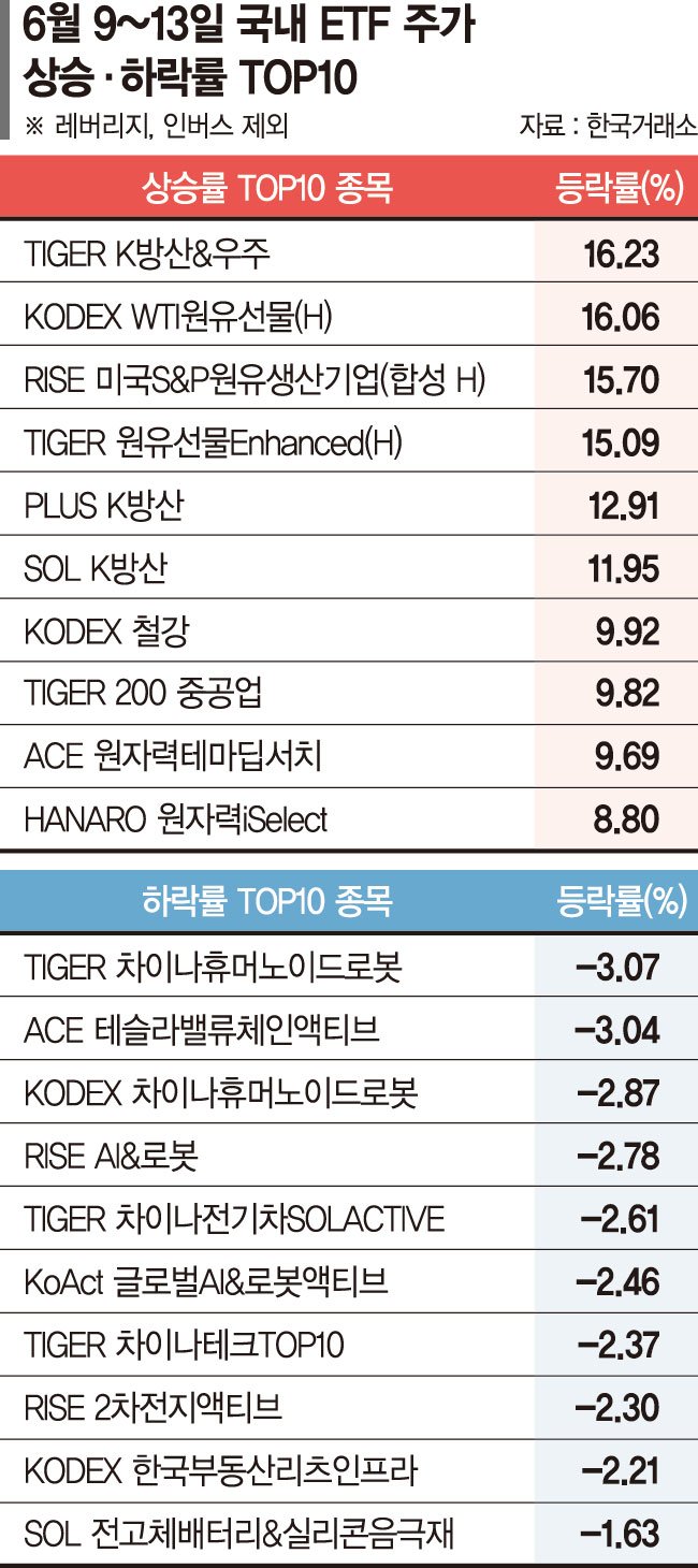 15일 한국거래소와 금융정보업체 에프앤가이드에 따르면 지난 9일부터 13일까지 국내 ETF 시장에서 가장 높은 수익률을 기록한 종목은 'TIGER K방산&우주'로 16.23% 올랐다. 이어 'KODEX WTI원유선물(H)'과 'RISE 미국S&P원유생산기업(합성 H)'도 각각 16.06%, 15.70%의 상승률을 보였다. 이번 조사에서 레버리지 및 인버스 등은 제외했다.