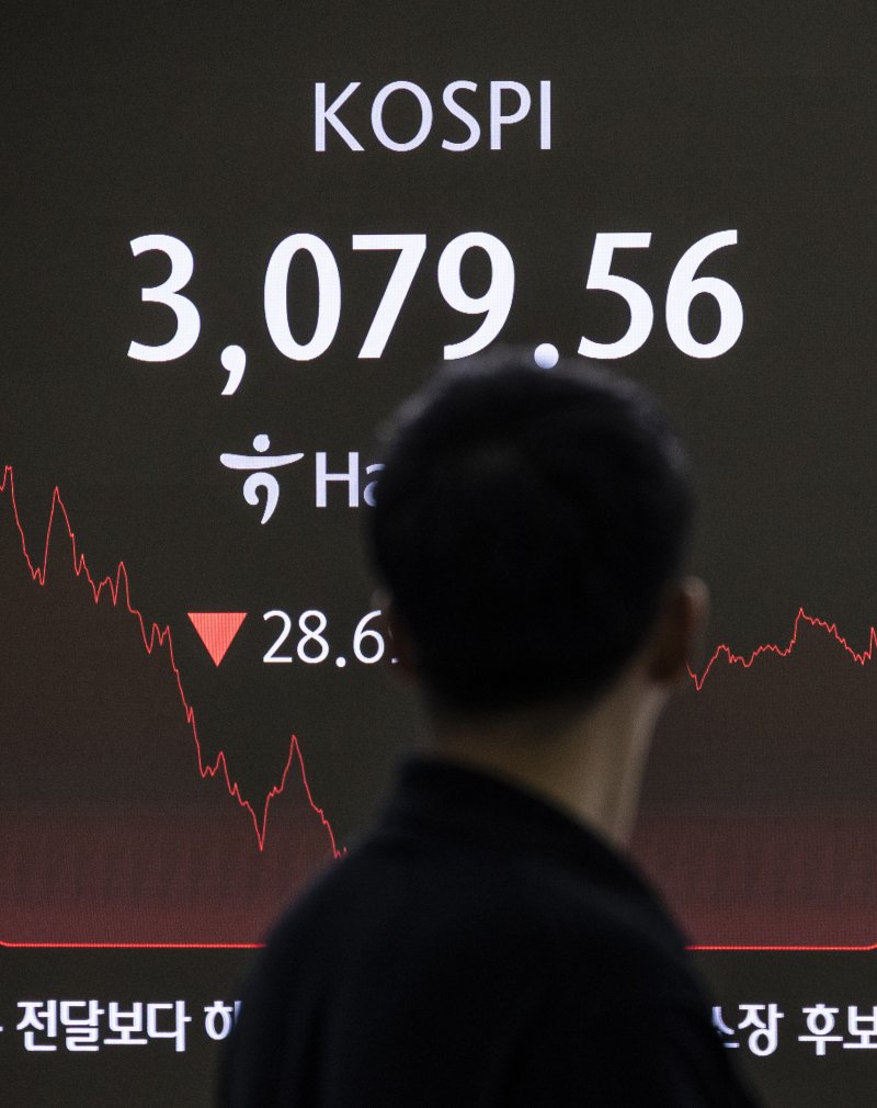 | 코스피 지수는 26일 전날보다 28.69p 내린 3079.56으로 장을 마쳤다. 코스닥 지수도 전날보다 10.26p 내린 787.95로 거래를 마감했다. 이날 서울 중구 하나은행 딜링룸 연합뉴스 |