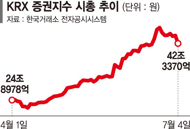 6일 한국거래소에 따르면 지난 4일 기준 'KRX증권'의 시가총액은 42조3370억원으로 집계됐다. 지난 4월 1일 24조8980억원에 불과했던 시총은 지난달 초 34조원까지 불어나더니 같은 달 25일에는 47조원까지 늘어났다. 이달들어 조정에도 40조원대를 유지했다. 3개월만에 (4월 1일~7월 4일)에만 두 배 가까이 증가한 셈이다.