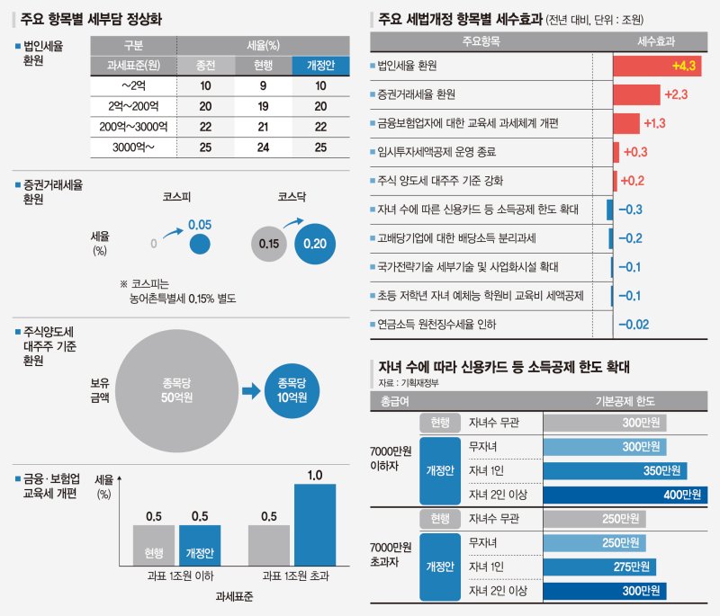 배당소득 분리과세가 '선택적 감세'라면, 대주주 주식 양도세 기준 환원은 '부자 증세'다. 상장법인 대주주가 보유한 주식을 처분할 때 내는 양도소득세의 종목당 시가총액 기준을 현행 50억원 이상에서 10억원 이상으로 2년 만에 되돌리는 내용이다. 현재는 상장주식 50억원어치 이상(종목당) 보유한 대주주만 22~27.5% 세율로 주식 양도세(지방소득세 포함)를 낸다.