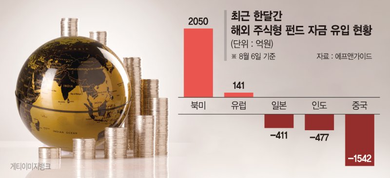 7일 금융정보업체 에프앤가이드에 따르면 지난 6일 기준 최근 한 달간 국내에 설정된 북미 주식 펀드 201종에 총 2050억원의 자금이 유입됐다. 같은 기간 유럽에 투자하는 주식형 펀드 38종에는 141억원이 순유입됐다.