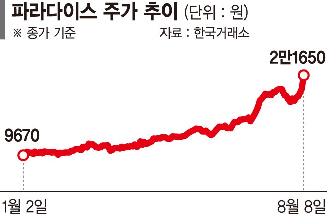 10일 한국거래소에 따르면 파라다이스는 지난 8일 유가증권시장에서 전 거래일 대비 11.03% 오른 2만1650원에 거래됐다. 이 회사의 주가는 최근 5거래일 연속 상승했으며 지난 10일 장중 한때 2만2600원으로 52주 신고가를 경신했다. 롯데관광개발은 이달 들어 지난 5일 장중 1만8950원까지 거래되며 연고점을 경신했다. 이날 종가 기준으로 최근 한달 간 외국인 순매수 금액은 522억원, 기관 순매수 자금은 76억원에 달했다.