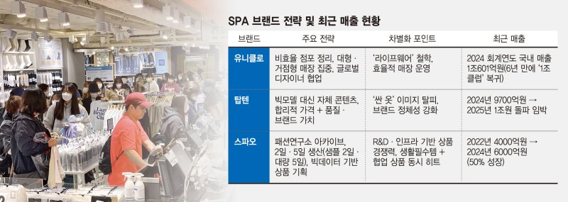 3일 패션업계에 따르면 글로벌 경기침체로 소비가 위축된 상황에서도 SPA 브랜드는 합리적 소비 심리와 기민한 생산·유통 구조를 기반으로 시장 입지를 확대하고 있다. 유니클로는 2024년 회계연도 기준 한국 매출이 1조601억원을 기록해 2019년 불매운동 여파 이후 6년 만에 다시 '1조원 클럽'에 복귀했다. 이랜드 스파오는 2022년 4000억원에서 2024년 6000억원으로 매출이 50% 이상 성장했고,