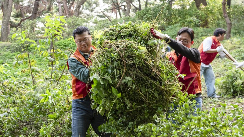 | 이호정 SK네트웍스 대표이사(왼쪽)가 지난 1일 서울 남산공원 소래풀군락지를 찾아 환삼덩굴, 쇠뜨기 등 유해식물을 제거하고 주변 환경을 청결케 하는 봉사활동을 하고 있다. SK네트웍스 제공 |
