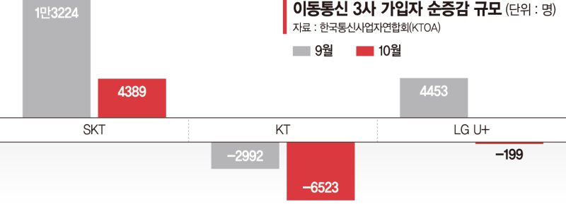 통신 업계 관계자는 "KT의 가입자 순감 수준이 지난 4~5월 SKT에 비하면 심각하지 않다"며 "향후 대표이사 선임과 위약금 면제 여부가 변수"라고 전했다. 최근 해킹 정황을 신고한 LG유플러스는 8만7283명이 들어오고 8만7482명이 빠져나가면서 199명 순감했다. 지난 9월 4453명의 순증세를 보였으나 감소세로 돌아선 것이다.