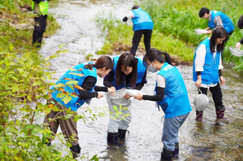 | HK이노엔 임직원들이 최근 경기 성남 율동생태학습원에서 열린 '생물다양성 탐사' 활동에 참여하고 있다. HK이노엔 제공 |