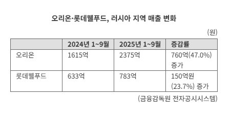 롯데웰푸드도 올 3·4분기까지 러시아 법인의 매출이 783억원을 기록했다. 이는 지난해 같은 기간(633억원) 대비 150억원(23.7%) 증가한 수치다. 롯데웰푸드는 최근 글로벌 시장에서 인기가 높아지고 있는 빼빼로를 필두로 빙과, 초코파이류 등의 제품을 판매하며 러시아 지역 매출이 증가하고 있다.