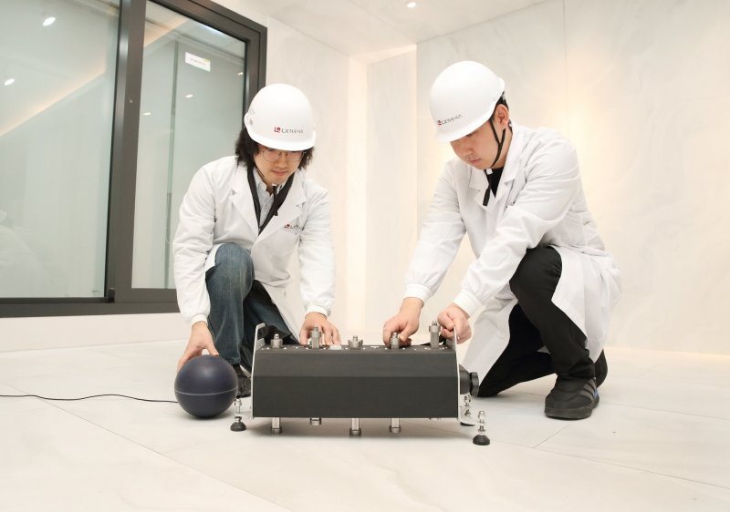 | LX하우시스 연구원들이 바닥충격음 테스트를 진행하고 있다. LX하우시스 제공 |