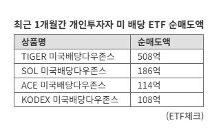 미국배당다우존스 ETF 중 순자산이 가장 큰 'TIGER 미국배당다우존스'에서는 508억원의 자금이 빠져나갔다. 주식형 ETF 중 개인투자자 순매도 3위다. SOL 미국배당다우존스에서 186억원(8위)을 팔았고, ACE 미국배당다우존스는 114억원(16위), KODEX 미국배당다우존스는 108억원(17위) 순매도가 나타났다.