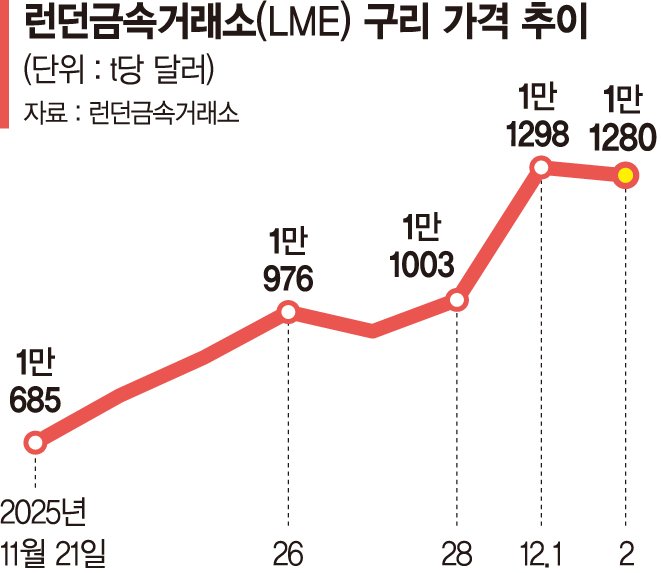 업계는 글로벌 공급 차질과 인공지능(AI) 데이터센터·재생에너지 산업의 전력 인프라 수요 확대가 최근 구리 가격 상승의 주요 요인이라고 보고 있다. 특히 글로벌 광산업체들이 급증하는 수요를 감당하지 못하는 가운데, 미국의 관세 부과 가능성에 대비해 미국 현지에 구리를 선반입하려는 움직임까지 겹치며 공급난을 더욱 심화시킨 것으로 풀이된다.