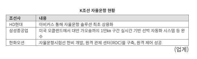 삼성중공업은 에버그린의 1만5000TEU 컨테이너운반선에 자율운항시스템을 탑재했다. 올해 미국 오클랜드에서 대만 가오슝까지 1만㎞ 구간에서 실시간 기반 선박 자동화 시스템, 상태 기반 유지보수, 선박 영상정보 등 원격 모니터링 지원 기술의 기능 시험을 성공적으로 완수했다. 지난 10월에는 일본 NK선급으로부터 선박 원격운용시스템에 대한 기본설계 인증을 획득했다.