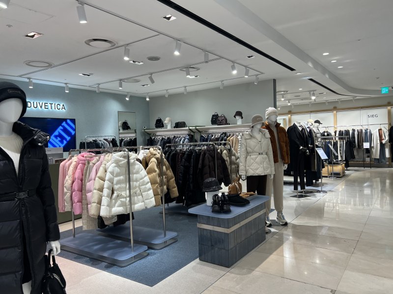 | 16일 서울 서대문구 현대백화점 신촌점 6층에 프리미엄 브랜드의 패딩이 진열돼 있다. 사진=김현지 기자 |