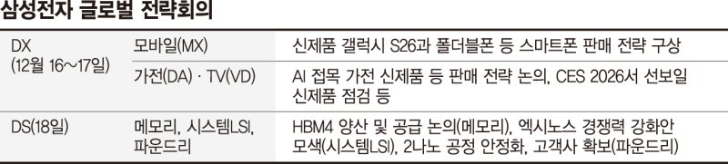 한편, 삼성전자는 내년 사업 전략을 구체화하기 위한 글로벌 전략회의도 이날 시작했다. 올해는 관세와 인공지능(AI) 사업 전환 등 디바이스경험(DX), 디바이스솔루션(DS) 각 부문별로 대내외 변화 속에서 해결책을 공유하는 자리가 될 전망이다. 16~17일에는 스마트폰과 가전(DA), TV(VD) 등을 담당하는 DX 부문 회의가, 18일에는 반도체 사업을 담당하는 DS 부문 회의가 열린다.
