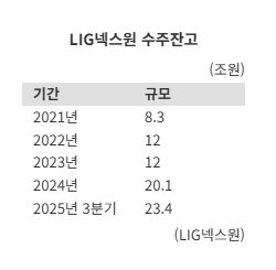 19일 업계에 따르면 LIG넥스원의 수주잔고는 2021년 8조3000억원, 2022년 12조원, 2023년 12조원, 2024년 20조1000억원, 2025년 3·4분기 23조4000억원으로 급증하고 있다. 2021년 말 대비 약 2.8배 증가한 수준으로, 연초 대비 17% 넘게 늘었다. 연간 매출액 대비 수주잔고는 약 6배를 상회하고 있다.