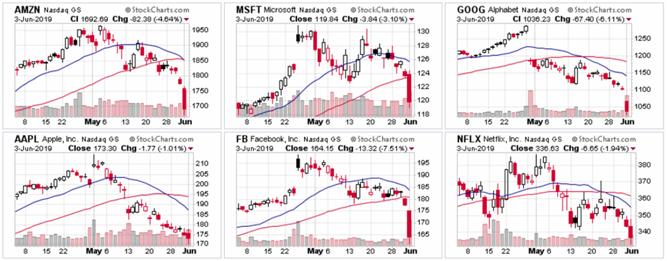 6월 첫날 뉴욕시장은 그간 상승을 리드해 오던 마이크로소프트 MSFT, 아마존 AMZN, 애플 AAPL, 구글 GOOG, 페이스북 FB, 넷플릭스 NFLX 등이 급락한 가운데, 경기 민감주 위주의 상승이 나타났다.