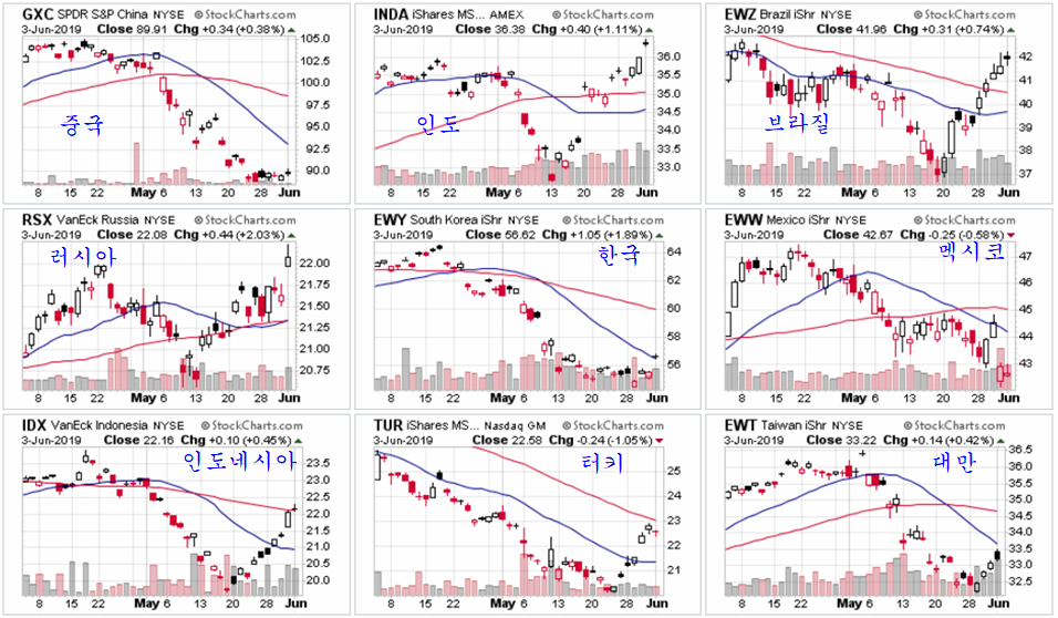 트럼프의 관세 공격을 받고 있는 중국 GXC와 멕시코 EWW의 ETF 펀드가 하락한 후 정체하는 모습을 보이고 있지만, 인도 inda, 브라질 ewz, 러시아 RSX, 인도네시아 IDX, 터키 TUR가 발빠른 상승이 이어지고 있고, 대만 EWT에 이어 한국 EWY가 뒤늦게 상승 흐름에 합류한 모습이다.