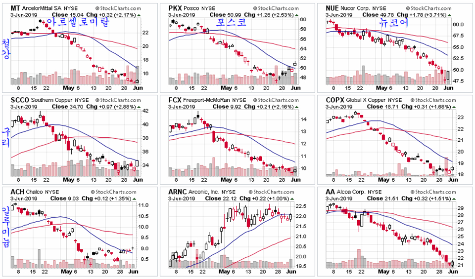 4월 18일 이후 특이한 장기 하락이 이어졌던 철강 , 구리, 알루미늄 등 금속주들은 일제히 상승 전환의 움직임이 나타나고 있다.