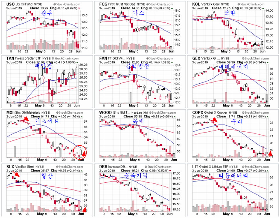 경기 민감섹터 펀드는 4월말 이후의 긴 조정 끝에 상승이 시작되고 있다. 기초재료 MXI와 함께 철강업 펀드 SLX, 구리 COPX, 석탄광업 KOL, 태양광 TAN. 풍력발전 FAN이 강한 상승을 하였다.