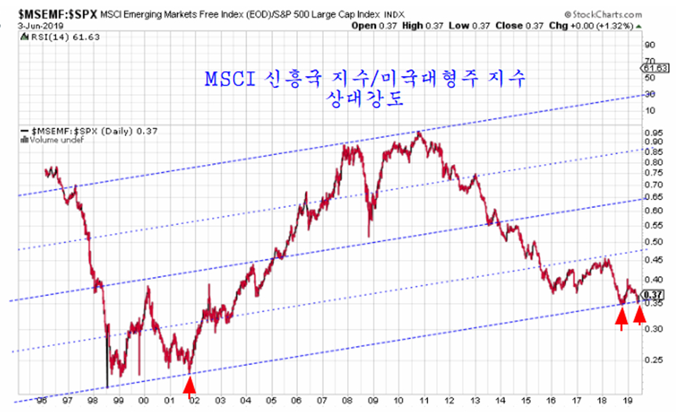 이것은 향후 미국 주가보다 신흥국 주가가 훨씬 빠르게 상승하게 됨을 예고한다. 그간 4차산업을 이유로 미국 대형주 지수가 고평가 상태로 상승한 가운데, 중국의 건설 경기 부진으로 산업재와 기초재료 관련 신흥국 주가가 저평가 상태로 하락이 이어졌지만 이런 흐름이 정상화되면서 신흥국 주가가 앞서 상승하게 됨을 의미한다.