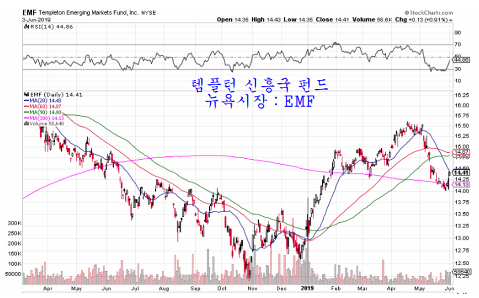 템플턴 자산운용사의 신흥국 펀드 EMF는 60주 평균을 지지권으로 상승이 시작되는 모습을 보여주고 있다.