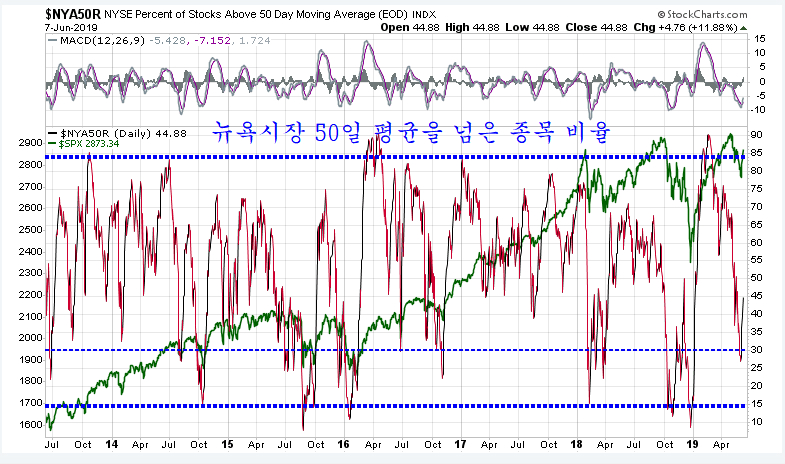 뉴욕시장의 50일 평균을 넘은 기업의 비율이 30%를 하회하는 과매도권이 되면서 하락 변동했던 주가는 다시 회복국면의 변화를 보이고 있다.