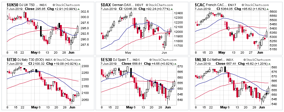유럽 증시도 주말 중기 추세 기준인 20일 평균을 돌파하는 상승과 함께 하락 변동 국면을 마무리하고 상승 국면으로 전환되고 있다.