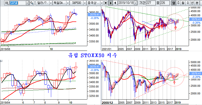 뉴욕종합지수는 전고점 근처에서 마무리 되면서 여전히 저항권이지만, 장기간 정체해 왔던 유럽 STOXX50 지수는 신고가와 함께 2007년고점과 2015년 및 2018년 고점을 잇는 10년 저항을 살짝 돌파한 채 마감되었다.