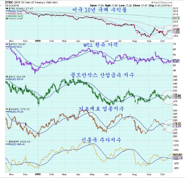 특히 원자재나 경기민감주에 영향이 큰 중국의 주가가 조정을 거쳤으므로 당연한 흐름인지 모른다. 다음 주에는 국채수익률의 20주 평균 돌파와, 이번주 상승의 움직임이 지체되었던 원자재와 경기주 상승 재개 여부가 관심이다.