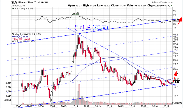 금 펀드는 2011년 이후 8년 대세 저항을 돌파한 후 본격적인 상승 출발의 모습을 갖추고 있고, 장기간 대세 채널의 바닥권에 머물러 있는 인플레이션 지표 금속인, 은 펀드는 비로소 고개르 쳐들며 월간으로 5.86% 상승하고 있다.