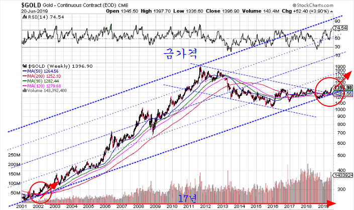 금 가격은 17년 전인 2002년 이평선 정배율을 이루며 상승을 시작한 후, 금속, 에너지, 곡물 등 원자재 상승과 함께 인플레이션과 경기 민감주를 중심으로 한 주식 시장 버블 붐 장세를 이끌었다.