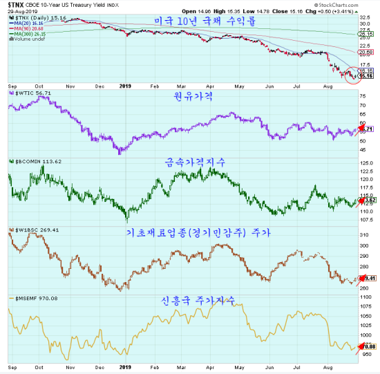 미국 10년 국채 숭기률은 지난해 11월 3.2%을 유지하다 7월말 2.0% 수준으로 1.2% 이상 하락하며 상승이기대되었으나 7월말 연준이 금리르 0.25% 이한하면서 채권 급등과 채권수익률 하락이 시작되어 현재 0.6% 이상 추가 하락한 1.4%대에 머물러 있다.