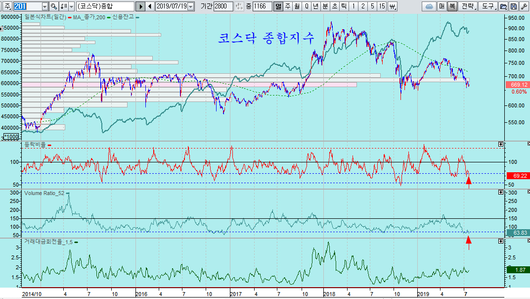 아울러 매물지표인 Volume Ratio가 중기 바닥권이라 할 수 있는 70선에 접근하여 있고 코스닥은 오히려 이 지수 아래에 있다.