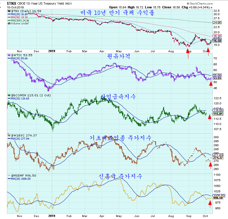 20일 평균을 이탈해 하락했던 세계의 국채 수익률은 급등하며 쌍바닥 상승이 시작되고 있고, 국채수익률과 함께 움직이는 원유가격, 금속가격, 기초재료업종 주가지수, 신흥국 주가지수가 모두 함께 상승했다.
