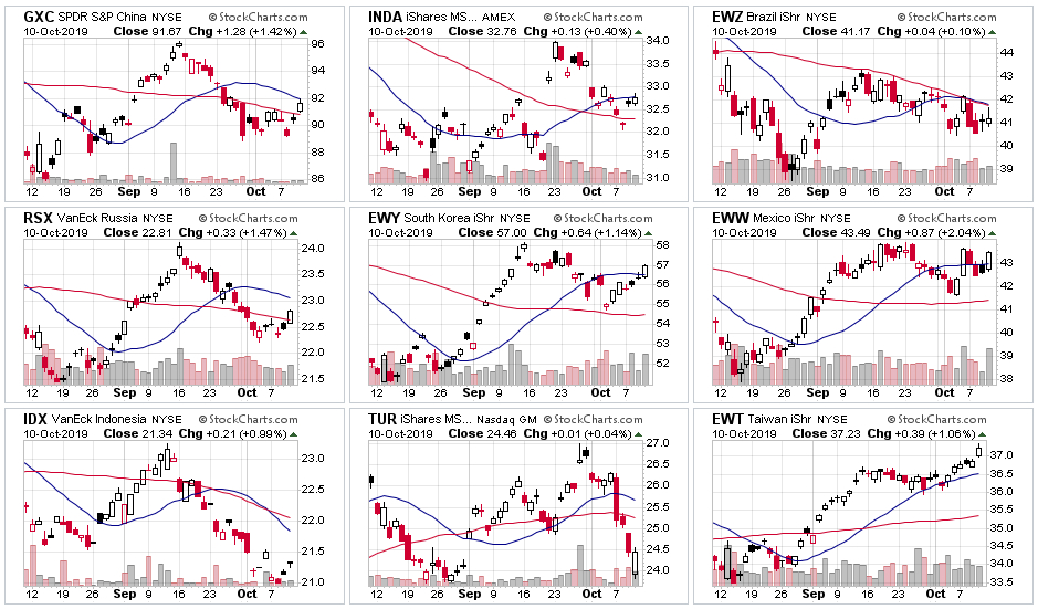 만기를 앞둔 한국 종합주가지수의 조정에도 불구하고 한국 펀드 ewy는 일주일째 상승을 이어가며 20일 평균을 넘어섰고, 중국, 인도, 러시아, 멕시코 등 주요 증시가 모두 상승을 나타내고 있다.