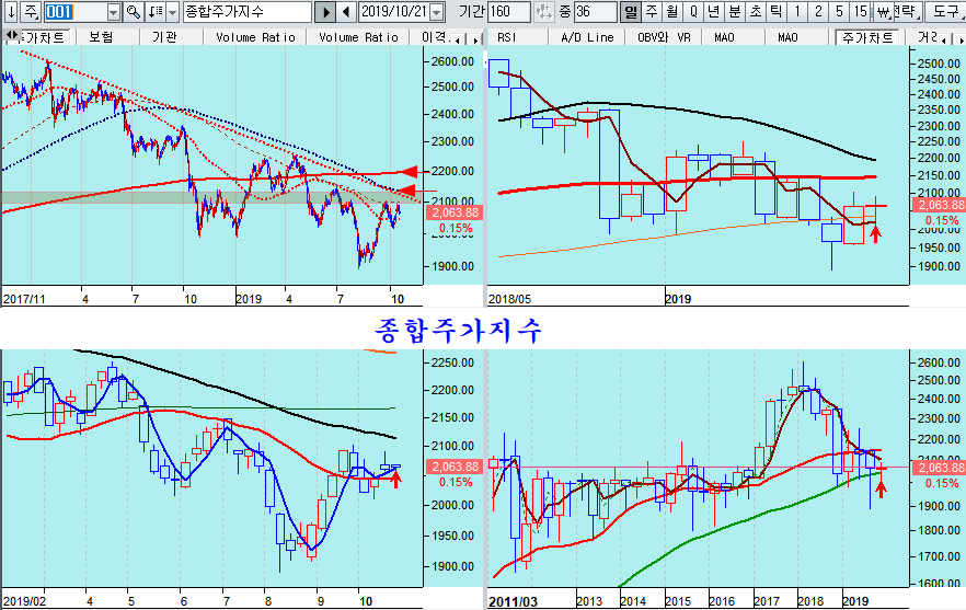 종합주가지수는 8월 최저가 이후 9월 월봉이 시가3선위에서 마감되었고, 10월 시가3선의 지지로 상승이 이어지면서 기술적인 상승 추세 국면이 이어지고 있다.
