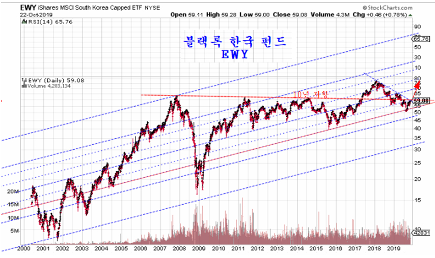 블랙록의 한국펀드 EWY는 지난 5월 이탈했던 저항까지 반등하면서 세로운 추세을 시작한 준비를 마무리하고 있다.